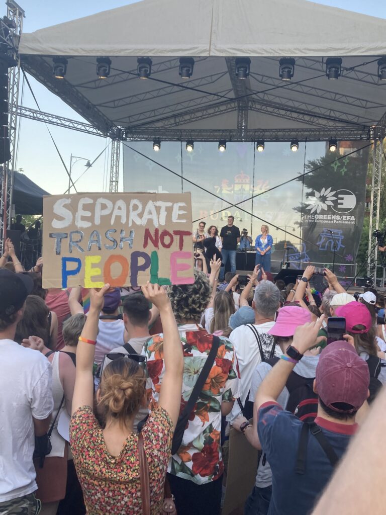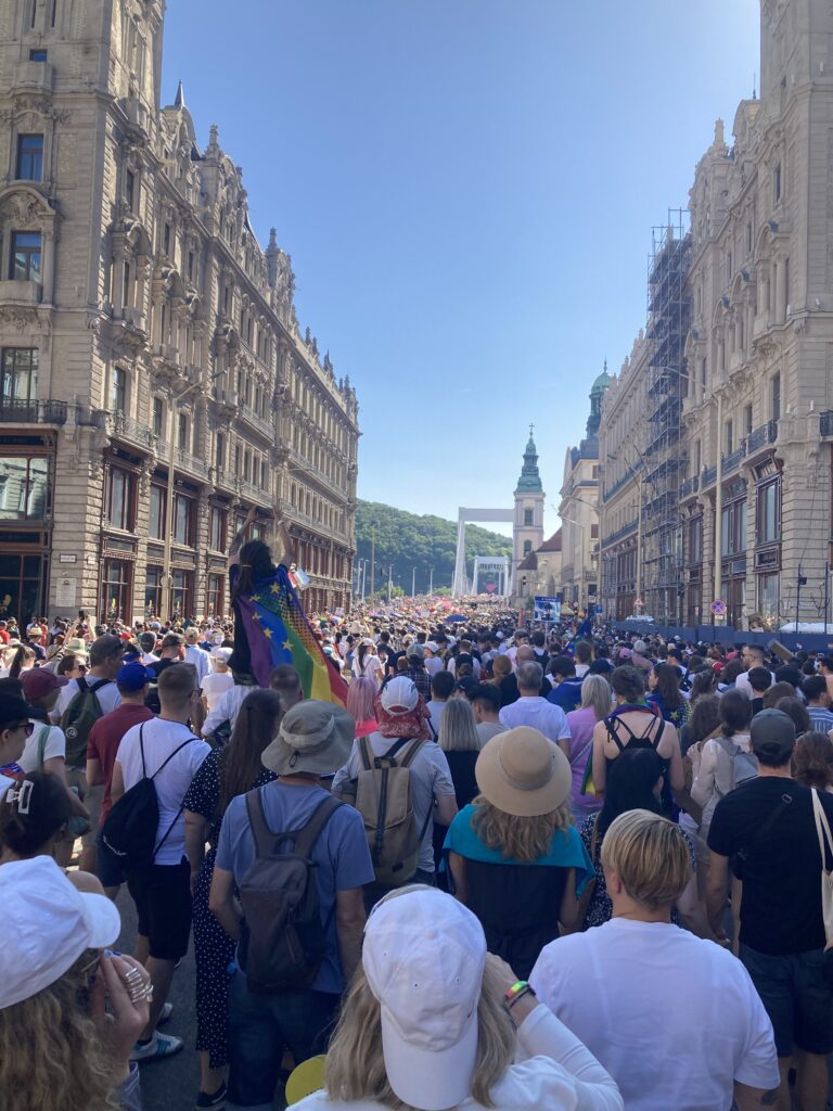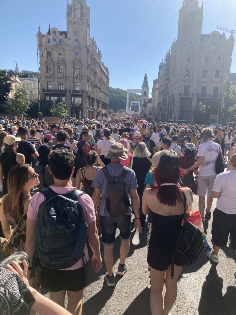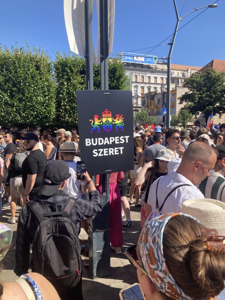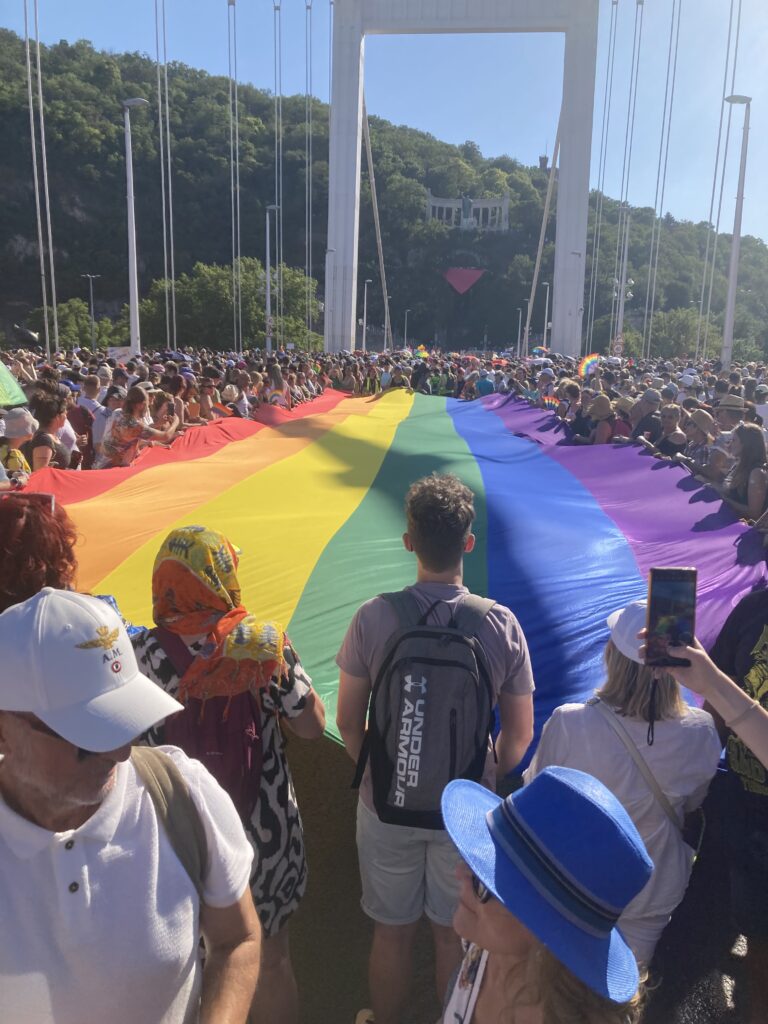 Egy Erzsébet hídon hullámzó óriási szivárványos zászlóval, egy DK-s kamionnal és egy Feri nélkül is önfeledten táncoló Klárival később végül beértünk az árnyékos rakpartra, innen kicsit fellélegezve sétálhattunk a Gellért-hegy felé. Ekkor még mindig képtelenség volt megítélni, hol járhat a masszív emberfolyam vége. A téren loptam egy nagy ölelést egy FREE HUG táblát lóbáló embertől, majd kis kerülővel a színpad mellé érve hallgattuk meg a felszólalásokat és produkciókat. A nap végén Karácsony Gergelynek méltán járt a standing ovation, főpolgármesterünk hónapokon át példásan és határozottan állt ki a Pride ügye mellett.